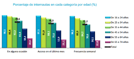 O número de persoas de 10 anos ou máis que accederon a Internet nalgunha ocasión supera os 29,5 millones en el año 2014, un 5,7% máis que hai 2 anos. Ademais se miramos cara a algúns dos tramos do tempo do ultimo uso de Internet, temos que o tramo dos últimos 3 meses medrou un 7,6% mentras que o tramo dos que hai máis dun ano diminuiu un 16,6%.