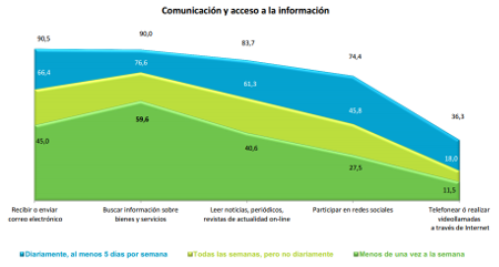 Nove de cada dez internautas que se conectan diariamente á rede, buscan información sobre bens e servizos e máis da metade colgan contidos propios para compartir con outros usuarios. Ademais o 60,1 % utiliza servizos relacionados con viaxes e aloxament.
